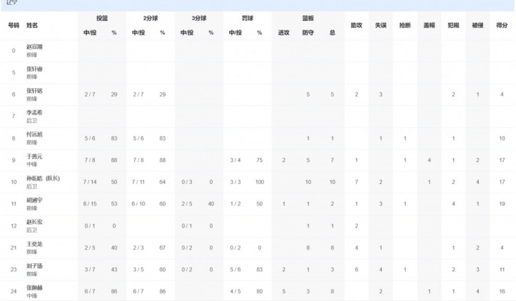 遼寧隊方面,胡涵宇19分2籃板1助攻,于善元17分7籃板1助攻,孫乾皓17分10籃板7助攻。