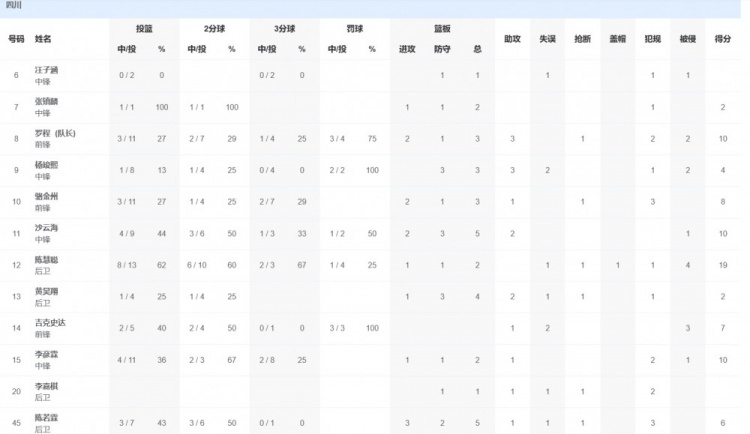 四川隊方面,陳慧聰19分2籃板,沙云海10分5籃板2助攻,張鎮(zhèn)麟2分2籃板。