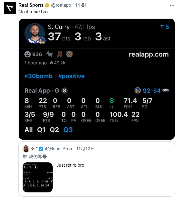 今日,體育應(yīng)用Real的官方推特賬號用今天的庫里數(shù)據(jù)截圖回?fù)袅薍oodiiBron:“‘退役吧兄弟?!?/p>