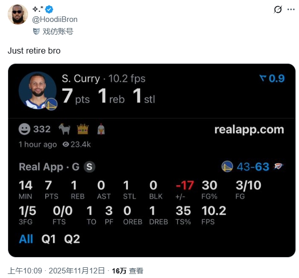 本場比賽,庫里轟下46+5+5;在昨日被雷霆暴揍的比賽中,一位叫HoodiiBron的網(wǎng)友曬出庫里的數(shù)據(jù)截圖,并表示:“退役吧兄弟。”