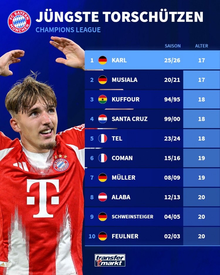 拜仁隊(duì)史歐冠最年輕進(jìn)球者排名:
