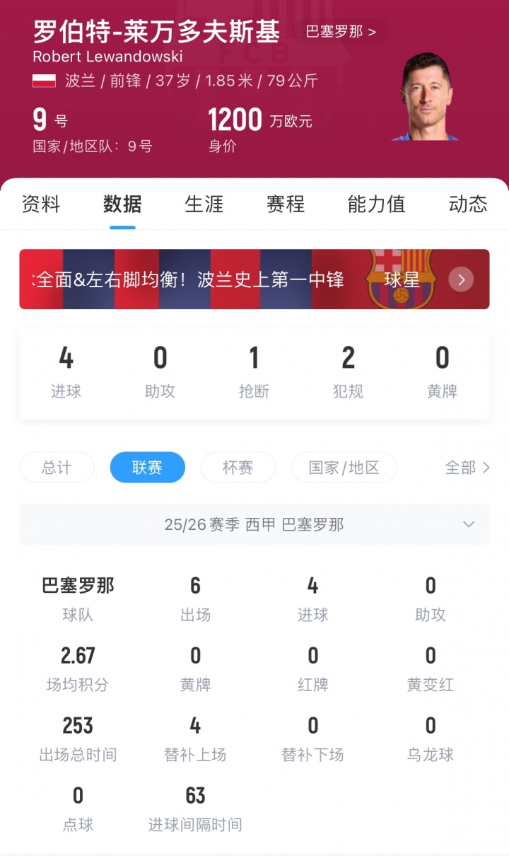 萊萬(wàn)現(xiàn)年37歲,他本賽季至今為巴薩出戰(zhàn)6場(chǎng)西甲,打進(jìn)4球,現(xiàn)身價(jià)1200萬(wàn)歐,他與巴薩的合同將于明年到期。