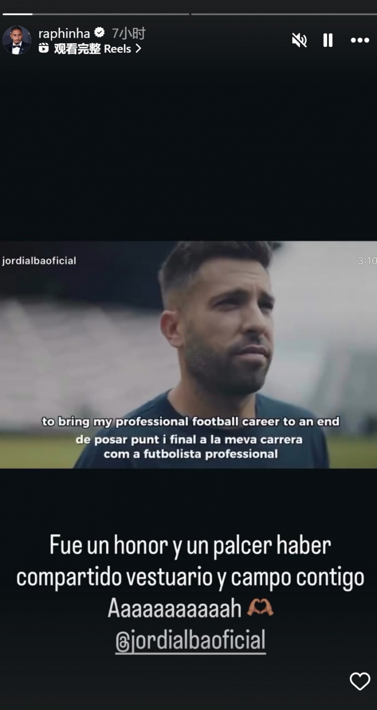 10月8日訊 西班牙邊衛(wèi)阿爾巴將在本賽季結(jié)束后退役,拉菲尼亞社媒發(fā)文致敬。