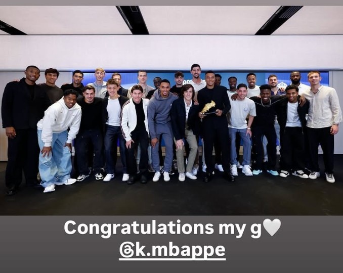 貝林厄姆也通過社媒曬出了皇馬全隊(duì)同手持金靴獎杯姆巴佩的合影,并配文:“祝賀我的兄弟@姆巴佩”。