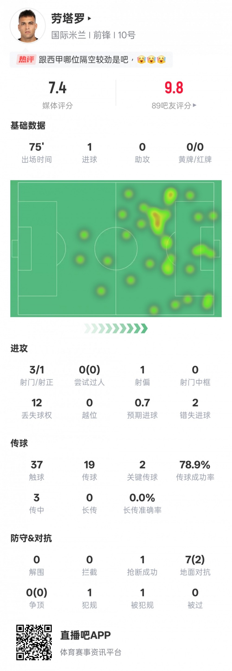 勞塔羅本場比賽數(shù)據(jù)如下: