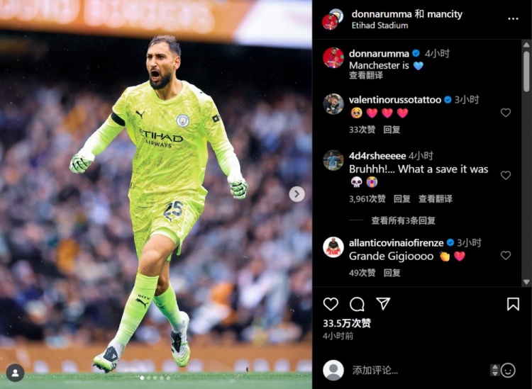 賽后這名完成曼城生涯首秀的門將更新社媒,曬出自己曼市德比賽場照,寫道:曼徹斯特是