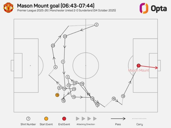 據(jù)統(tǒng)計(jì),芒特進(jìn)球前經(jīng)過18次傳球,這是本賽季英超進(jìn)球中最多,而曼聯(lián)上一次進(jìn)球前有如此多傳球還在2023年9月(B費(fèi)進(jìn)球)。