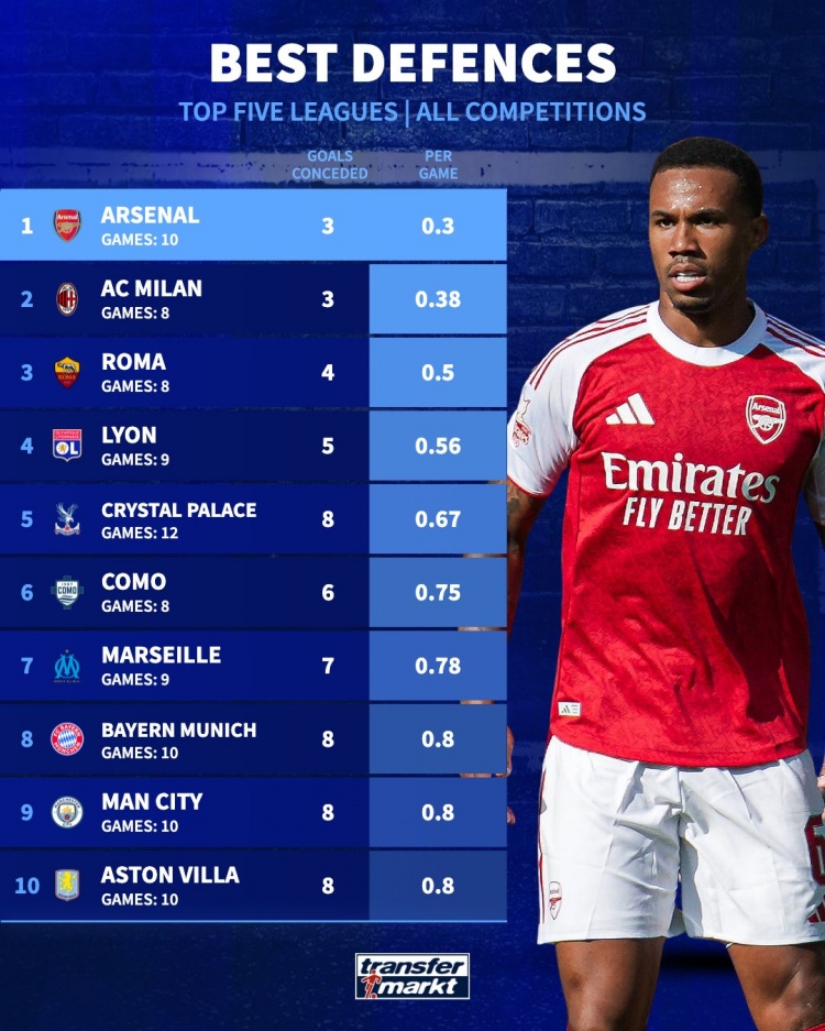 10月7日訊 德國轉會市場統(tǒng)計了五大聯(lián)賽球隊本賽季的場均丟球數(shù)量,并列出場均丟球最少排名,阿森納0.3球居首,米蘭0.38球次席。