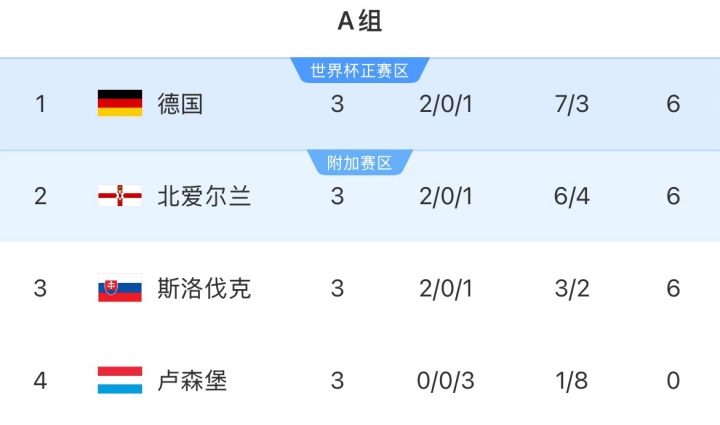 德國、北愛爾蘭和斯洛伐克均2勝1負,三隊同積6分。盧森堡三連敗墊底。