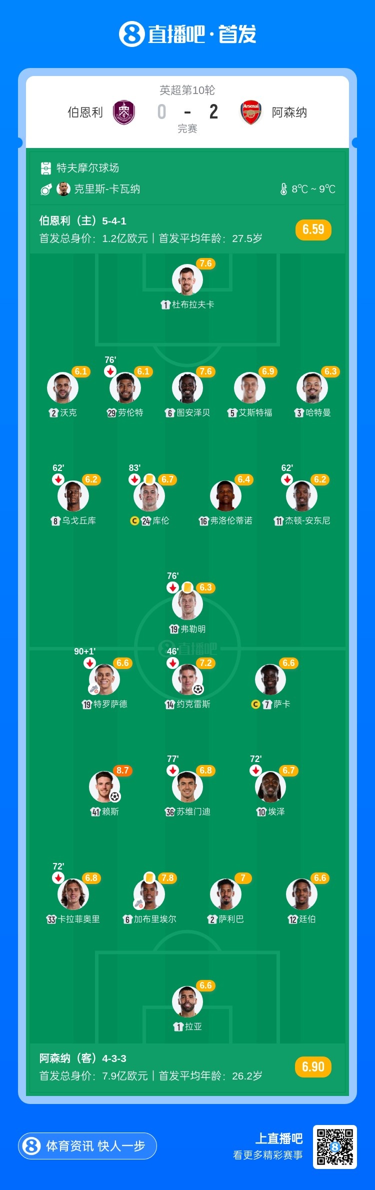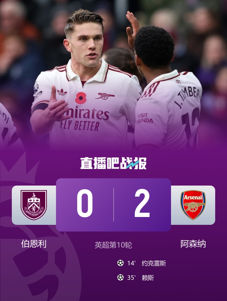 全場比賽結(jié)束,最終阿森納2-0伯恩利。