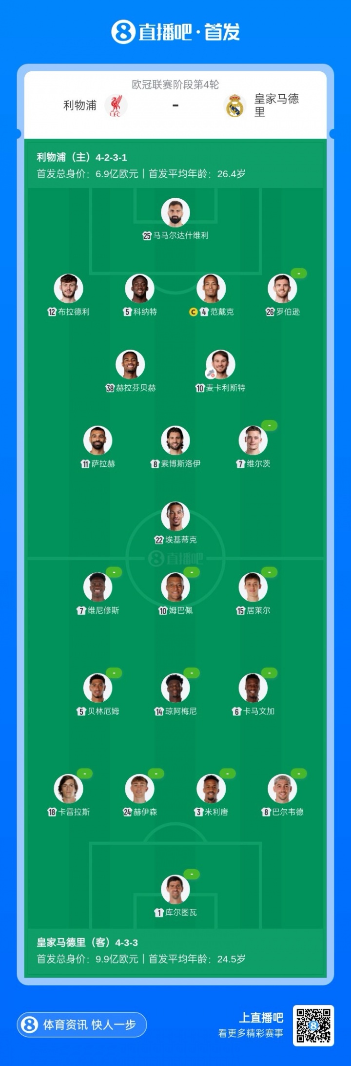 11月5日訊 歐冠聯(lián)賽階段第4輪焦點戰(zhàn),利物浦主場迎戰(zhàn)皇馬比賽即將打響。賽前首發(fā)出爐。