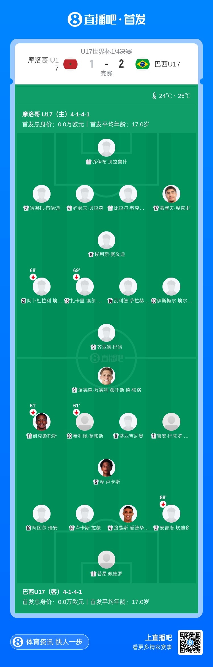 11月22日訊 北京時間23:45,U17世界杯1/4決賽摩洛哥U17vs巴西U17。上半場,巴西隊率先取得領(lǐng)先,但半場補時階段摩洛哥獲得點球,巴哈點射扳平!下半場,補時階段溫德森·梅洛讀秒絕殺!最終,巴西2-1擊敗摩洛哥,晉級U17世界杯4強!