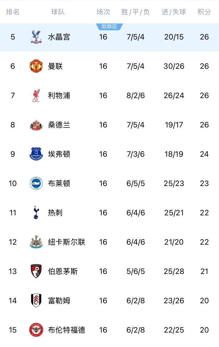 英超第16輪戰(zhàn)罷,前三強(qiáng)與后面的球隊(duì)拉開分差。英超從第5(水晶宮)到第15(布倫特福德)之間,僅相差6分。其中第5水晶宮、第6曼聯(lián)、第7利物浦、第8桑德蘭同積26分。