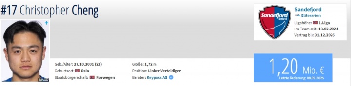 09月19日訊 德轉(zhuǎn)更新了挪威聯(lián)賽的身價(jià),華裔邊后衛(wèi)鄭澤彥身價(jià)繼續(xù)上漲至120萬(wàn)歐。