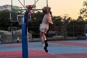 將球跨過雙腿再將球環(huán)繞背后一圈飛扣?擱扣籃大賽也能50分吧?