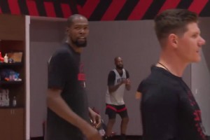 這一身紅真順眼杜蘭特穿火箭球衣亮相新賽季訓(xùn)練營