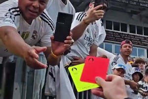 活久見世俱杯皇馬vs帕丘卡賽后,主裁判將紅黃牌送給皇馬球迷